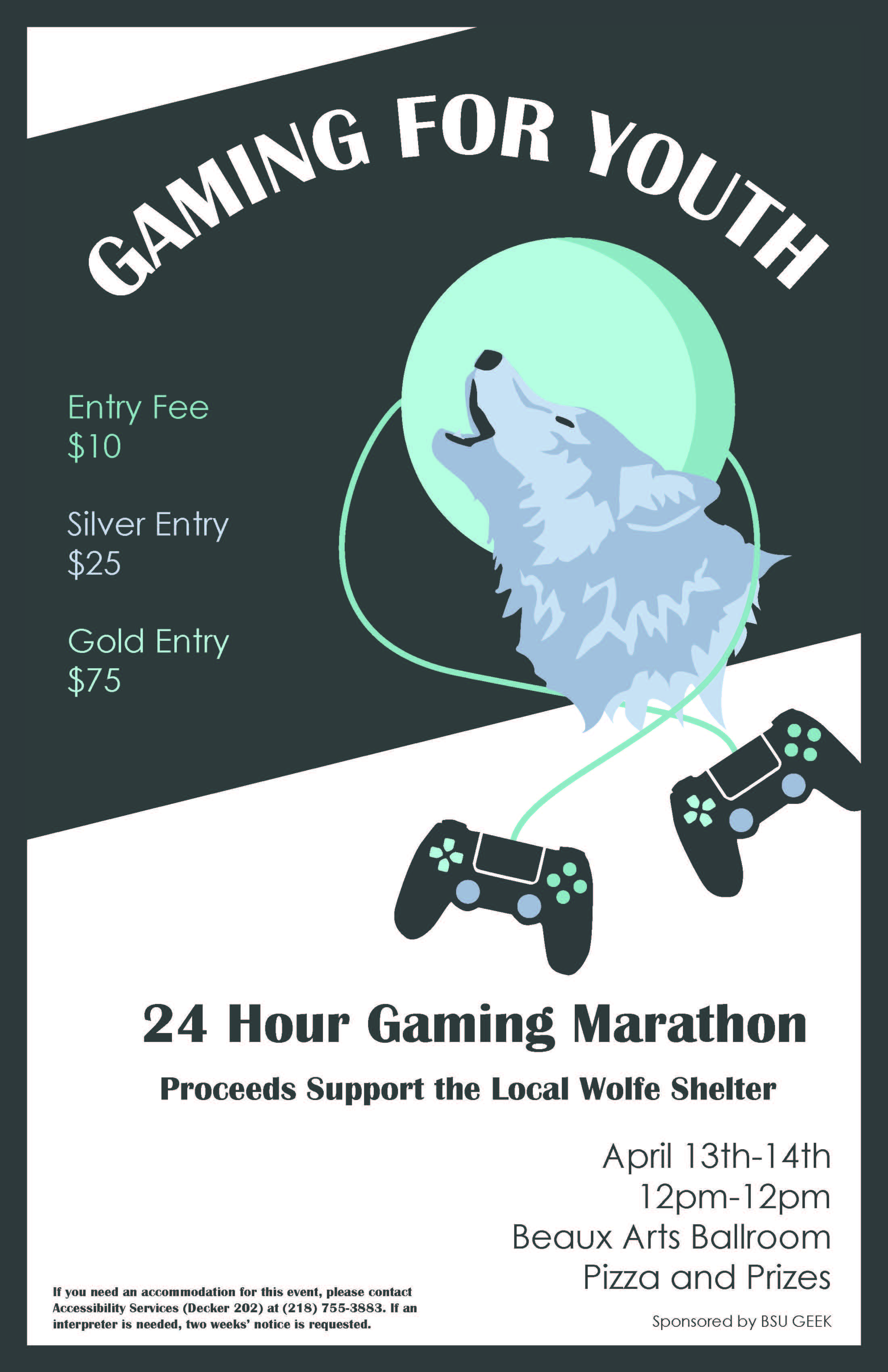 We will be participating in the next Bemidji State University Gaming & Entertainment Enthusiast Klub (G.E.E.K.) Gaming for Youth 24 Hour Marathon on April 13th in the Baux Arts Ballroom, BSU. The event will start at 12 PM and go till 12 PM on April 14th. Bring your favorite gaming platform (consoles, PCs, RetroPie, et al) and play all night long. The cover is $10 to play, the proceeds of which will be donated to the Nameless Coalition for the Homeless in behalf of the Wolfe Shelter. For more info on G.E.E.K visite their facebook page.